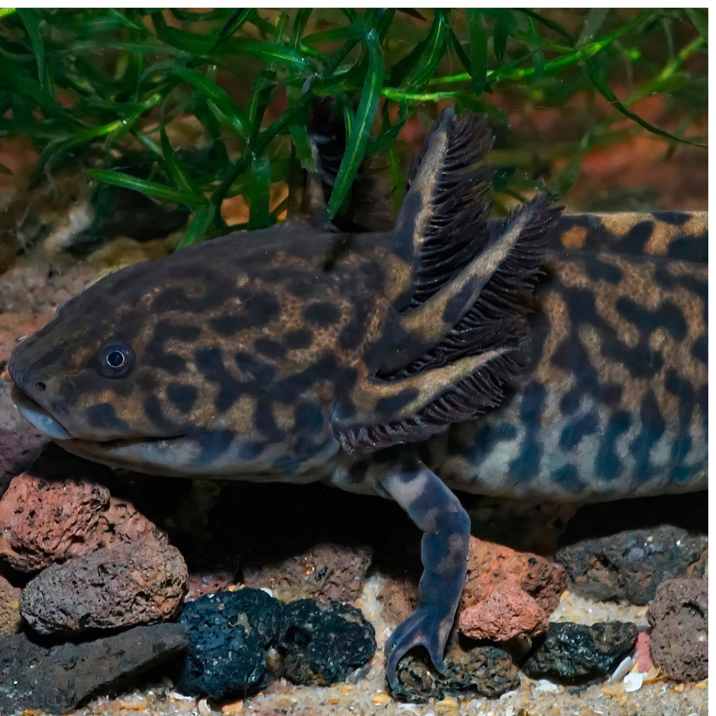El Axolote Moteado de 8 cm es una fascinante especie acuática que destaca por su singular apariencia y su coloración moteada que combina tonos claros y oscuros, ideal para aficionados a la biología y la acuariofilia.