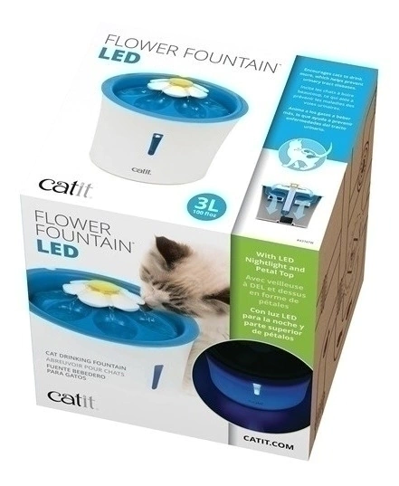 Combinando el diseño único que les encanta a los gatos con algunas características nuevas nunca antes vistas, la fuente de flores Catit acaba de recibir una actualización. El depósito de agua compacto de 3 L (100 fl oz) de Catit Flower Fountain LED fue diseñado para ocupar poco espacio en el piso. Las nuevas características incluyen una luz LED, que hace que la fuente se ilumine por la noche, y un práctico indicador de nivel de agua para que el agua de su gato nunca se agote. La característica única de la parte superior de pétalos vierte agua en los seis bolsillos, lo que le permite a su gato beber incluso cuando la fuente está apagada. ¡El LED Catit Flower Fountain permite hasta 3 configuraciones de flujo de agua diferentes para atraer a los bebedores exigentes! Los dueños de gatos pueden cambiar entre agua que fluye suavemente, chorros de agua parecidos a un grifo o chorros de agua con una tapa burbujeante. La fuente proporciona agua limpia y fresca en todo momento empujando solo agua corriente filtrada a la superficie. Es fácil de desmontar y limpiar y tiene un diseño ergonómico que ayuda a prevenir el estrés de los bigotes y el acné felino.